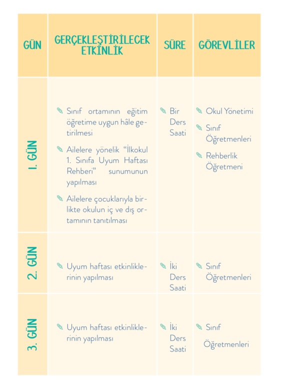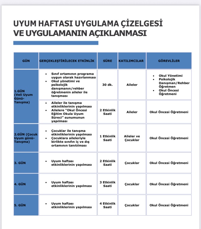 İlkokul 1.Sınıflarımızın ve Okul Öncesi sınıflarımızın haftalık uyum programıdır.
